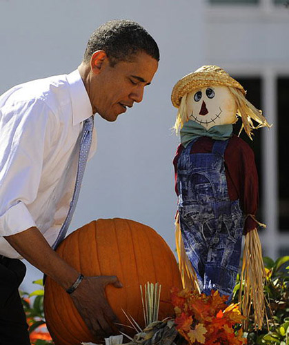 10月30日,在美國(guó)佛羅里達(dá)州的薩拉索塔,選戰(zhàn)中四處奔走的美國(guó)民主黨總統(tǒng)候選人奧巴馬忙里偷閑,來(lái)到當(dāng)?shù)氐囊患夷瞎蠄@摘南瓜,享受片刻悠閑。