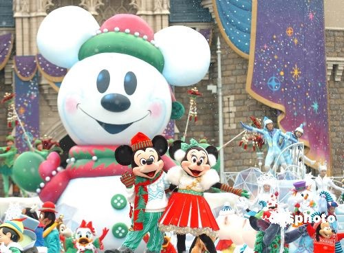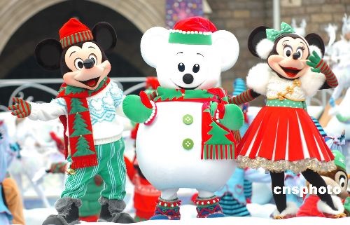 11月7日,東京迪斯尼為迎接2008年圣誕推出了新的卡通形象“雪米奇”。數(shù)萬游客從四面八方趕至爭相一睹這個(gè)漂亮善良的新朋友。圖為在歌舞表演中的米奇、米妮與雪米奇。中新社發(fā) 朱沿華 攝