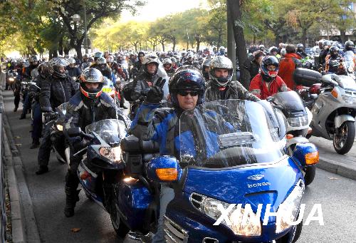 11月8日,眾多摩托車手在西班牙首都馬德里市中心街道參加大游行。當(dāng)日,來自西班牙各地的上萬名摩托車手在首都馬德里參加大游行,呼吁政府部門改善道路交通條件,保障摩托車出行安全。據(jù)統(tǒng)計(jì),西班牙2007年共有500余名摩托車手在交通事故中喪生。新華社記者陳海通攝