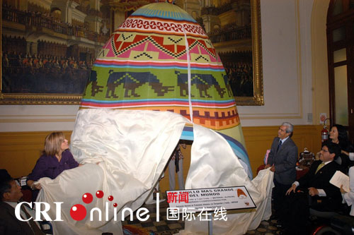 為慶祝即將召開(kāi)的亞太經(jīng)合組織第16次領(lǐng)導(dǎo)人非正式會(huì)議,秘魯人特意制作了一頂世界上最大的印第安絨帽,并于19日在秘魯國(guó)家博物館展出。