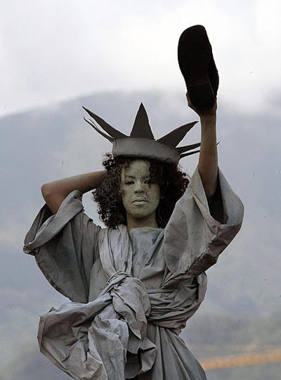 1月8日,在委內(nèi)瑞拉首都加拉加斯的以色列大使館前,一名裝扮成自由女神的女子手舉一只鞋子,抗議以色列在加沙地帶展開的軍事行動(dòng)。