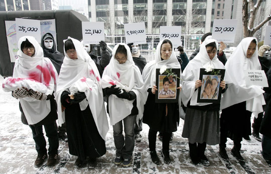 1月16日,韓國一些民眾聚集在首爾以色列使館前進(jìn)行示威,幾位婦女手舉象征在戰(zhàn)火中喪生的兒童照片和玩偶,抗議以色列襲擊加沙。