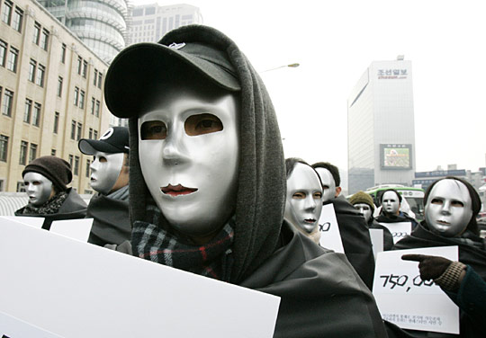 1月16日,韓國一些民眾頭帶面具聚集在首爾以色列使館前進(jìn)行示威,抗議以色列襲擊加沙。