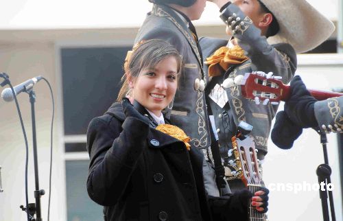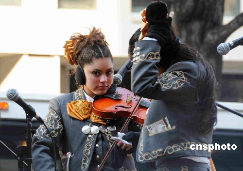 美國東部時(shí)間1月20日中午11點(diǎn)30分,美國第44任總統(tǒng)奧巴馬在國會(huì)山前宣誓就職。下午,官方組織的一場游行在著名的華盛頓賓夕法尼亞大街舉行。圖為奧巴馬就職日游行隊(duì)伍中的拉提琴的美少女。中新社發(fā) 邱江波 攝