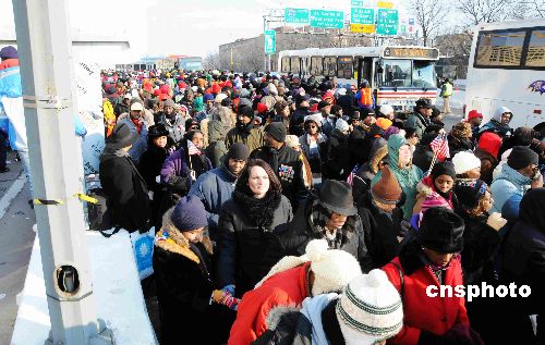 美國(guó)東部時(shí)間1月20日中午11點(diǎn)30分,美國(guó)第44任總統(tǒng)巴拉克·奧巴馬在國(guó)會(huì)山前宣誓就職。來(lái)自全美各地和世界各國(guó)的觀禮群眾200多萬(wàn)人聚集華盛頓國(guó)家大草地觀看了這一盛大的就職典禮。由于官方禁止一切非官方車(chē)輛出入首都,百萬(wàn)民眾在等待官方指定擺渡車(chē)時(shí),現(xiàn)場(chǎng)如同置身中國(guó)春運(yùn)。中新社發(fā) 邱江波 攝