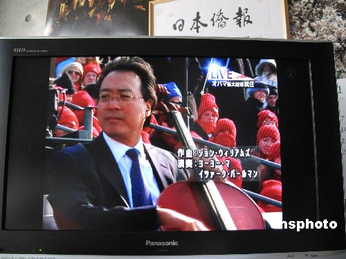 圖為日本電視臺實況轉播奧巴馬就職大典時馬友友演奏大提琴的鏡頭。美國華裔大提琴家馬友友,當?shù)貢r間1月20日中午在奧巴馬的就職大典上,與其它三位音樂家合演了《空氣與簡樸禮物》(Air and Simple Gifts),獻給新總統(tǒng)。據(jù)報道,馬友友曾應邀在五位美國總統(tǒng)面前獻藝,最早的一位是肯尼迪總統(tǒng),當時的馬友友年僅七歲,與胞姐一起在白宮演出。馬友友16日接受哥倫比亞廣播公司訪問時興奮地說,“簡直不敢相信,這是四十五年前的事了”。但這可能比不上1月20日為奧巴馬在就職典禮上的表演,讓他感到更光榮與驕傲。中新社發(fā) 段躍中 攝