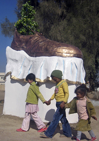 1月30日,伊拉克藝術(shù)家創(chuàng)作了這座鞋形雕塑,以對(duì)向美國時(shí)任總統(tǒng)布什扔鞋的伊拉克記者蒙塔茲·扎伊迪致敬。這座雕像于1月29日正式亮相。