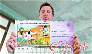 據(jù)悉,英軍士兵在塔利班據(jù)點內一面墻上發(fā)現(xiàn)這本月歷。與普通的美女、跑車或者風景月歷不同,塔利班月歷一月份封面人物是基地組織頭目拉登和塔利班最高頭目奧馬爾,他們身邊放著錢和武器,手指著被塔利班炸毀的巴米揚大佛。二月份月歷封面是一個塔利班墳場。這本月歷上不僅有普什圖語,而且還有阿拉伯語、波斯語和英語。英軍上尉提姆-利云頓稱:“我先前從未看到過這樣的塔利班宣傳材料,尤其是使用非英語文字的!
