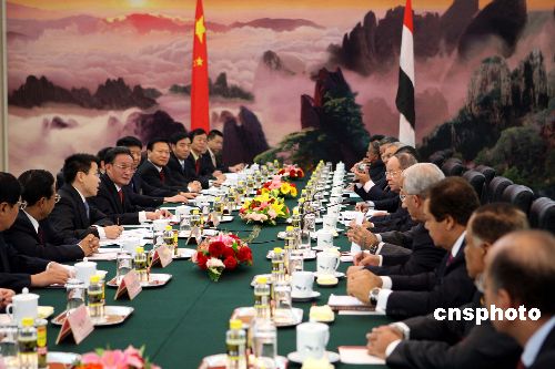 十月二十四日,吳邦國(guó)委員長(zhǎng)在北京人民大會(huì)堂會(huì)見(jiàn)由埃及人民議會(huì)議長(zhǎng)蘇魯爾率領(lǐng)的代表團(tuán)并主持會(huì)談?wù)絾?dòng)雙方交流機(jī)制。中新社發(fā) 任海霞 攝