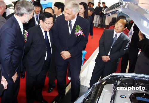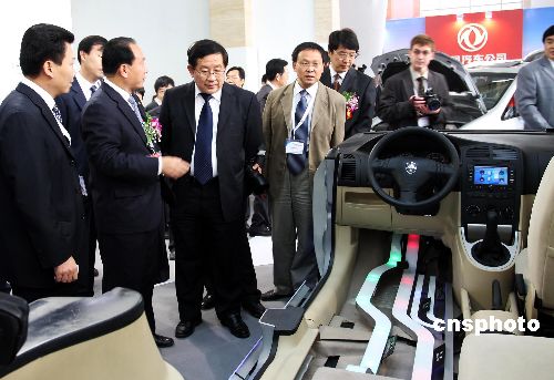 10月25日,第五屆北京國(guó)際節(jié)能環(huán)保汽車展覽會(huì)在北京開(kāi)幕,中國(guó)科技部部長(zhǎng)萬(wàn)鋼參觀展會(huì)上的展車。中新社發(fā) 鄭雄增 攝
