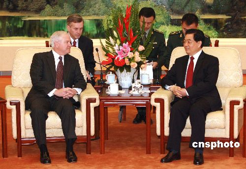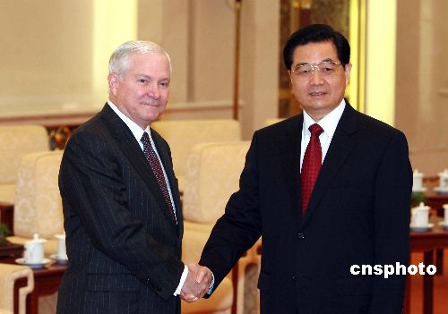 十一月六日,中國國家主席、中央軍委主席胡錦濤在北京人民大會(huì)堂會(huì)見美國國防部長羅伯特·蓋茨。中新社發(fā) 廖文靜 攝