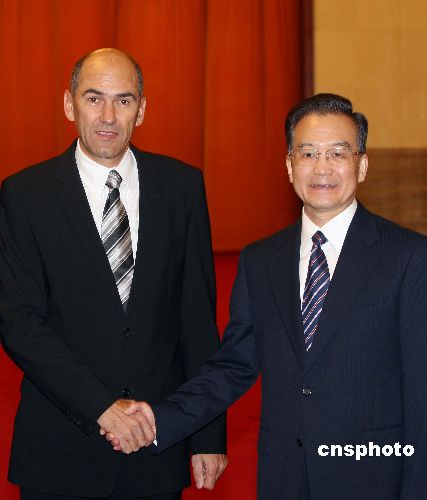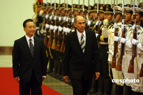十一月八日,中國國務院總理溫家寶在北京人民大會堂舉行儀式,歡迎來訪的斯洛文尼亞總理揚沙。中新社發(fā) 毛建軍 攝