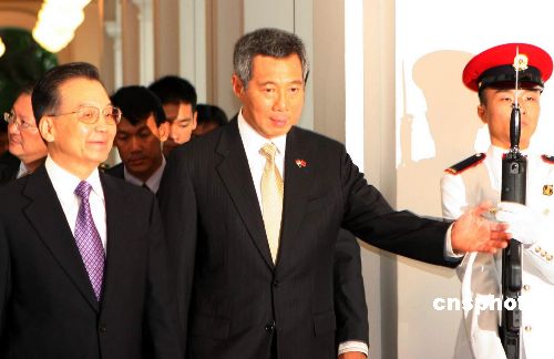 新加坡總理李顯龍十一月十八日下午在總統(tǒng)府前廣場舉行儀式,歡迎到訪的中國國務(wù)院總理溫家寶。溫家寶總理當(dāng)天下午乘專機(jī)抵達(dá)新加坡,旋即展開訪新行程。歡迎儀式后,溫家寶與李顯龍舉行了會談,兩國總理對加強(qiáng)中新關(guān)系、推進(jìn)重點(diǎn)領(lǐng)域合作以及共同關(guān)心的國際和地區(qū)問題交換了意見,共同出席了中新《生態(tài)城框架協(xié)定》的簽字儀式。這是應(yīng)李顯龍的邀請,中國國務(wù)院總理八年來的首次訪問新加坡。中新社發(fā) 周群 攝