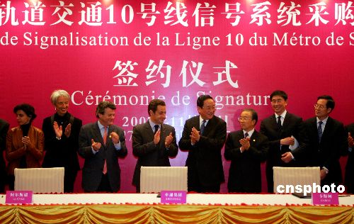 11月27日,中共中央政治局委員、上海市委書記俞正聲(右四),與在上海訪問的法國總統(tǒng)尼古拉·薩科齊(左四),共同出席上海申通地鐵集團(tuán)公司與法國阿爾斯通公司關(guān)于上海軌道交通10號(hào)線信號(hào)系統(tǒng)采購合同簽約儀式。中新社發(fā) 湯彥俊 攝
