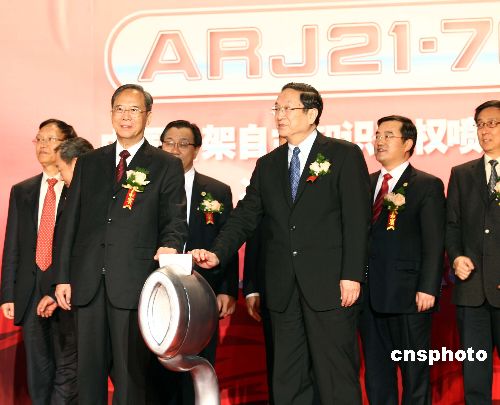 十二月二十一日,由中國航空工業(yè)第一集團公司(中國一航)自行研制生產(chǎn)的中國首架自主知識產(chǎn)權(quán)噴氣支線客機ARJ21-700飛機,在上海飛機制造廠順利實現(xiàn)總裝下線。中國國務(wù)院副總理曾培炎(前排左)和中共中央政治局委員、上海市市委書記俞正聲(前排右)出席隆重的總裝下線儀式。中新社發(fā) 文音 攝