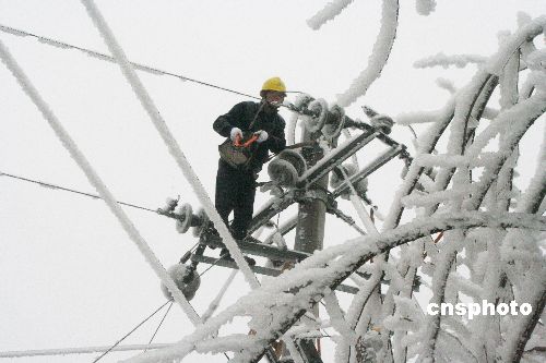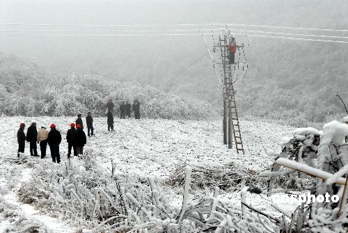 1月20至21日,黔東南州各縣電力職工在搶修受冰凍災(zāi)害的電力設(shè)施。連日來,由于持續(xù)出現(xiàn)大范圍雪凝天氣,貴州省黔東南州境內(nèi)的凱里電網(wǎng)(轄管黔東南州各縣市)遭遇自1984年以來最為嚴(yán)重的冰凍災(zāi)害,凱里電網(wǎng)部門及下屬的15家縣局已緊急采取措施,確保電網(wǎng)穩(wěn)定運(yùn)行。1月14日以來,貴州黔東南地區(qū)溫度均在零下1攝氏度,是24年以來最為嚴(yán)重的一次,出現(xiàn)嚴(yán)重的覆冰。覆冰導(dǎo)致一些輸電設(shè)施桿塔和導(dǎo)地線不堪重負(fù)而倒塔斷線,電網(wǎng)設(shè)施受損嚴(yán)重。截止1月21日,凱里電網(wǎng)出現(xiàn)孤網(wǎng)運(yùn)行,各縣農(nóng)網(wǎng)線路等輸配電線路都不同程度出現(xiàn)倒桿斷線的情況,造成黔東南州南部電網(wǎng)七個縣全部停電。冰災(zāi)發(fā)生后,凱里電網(wǎng)部門迅速啟動“抗冰保電”應(yīng)急預(yù)案,同時(shí)在當(dāng)?shù)孛襟w發(fā)布停電預(yù)警公告,并積極做好醫(yī)院、交通、通訊、礦山等重要客戶的安全用電工作。中新社發(fā) 吳如雄 攝