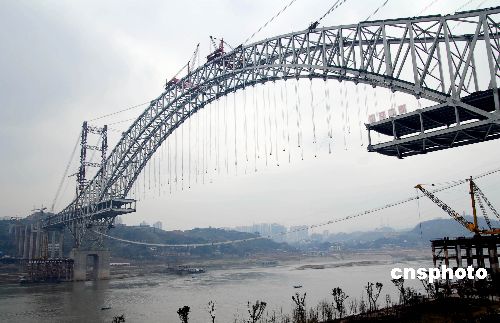 1月25日,“世界第一拱橋”的重慶朝天門長江大橋主拱合龍。大橋主跨將在今年6月合龍,并于年底竣工通車。重慶朝天門長江大橋2004年底動(dòng)工,由主橋和東西引橋三部分組成,為中承式鋼桁系桿拱橋,雙層設(shè)計(jì),上層為雙向6車道,下層為雙向輕軌和雙向4條預(yù)留車道。大橋兩座主墩主跨長達(dá)552米,比世界著名拱橋澳大利亞悉尼大橋的主跨還要長,成為“世界第一拱橋”。中新社發(fā) 郭晉嘉 攝