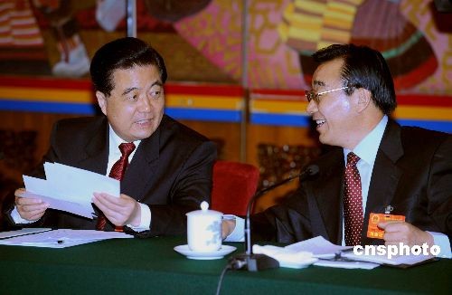 圖:胡錦濤與西藏代表共同審議政府工作報(bào)告