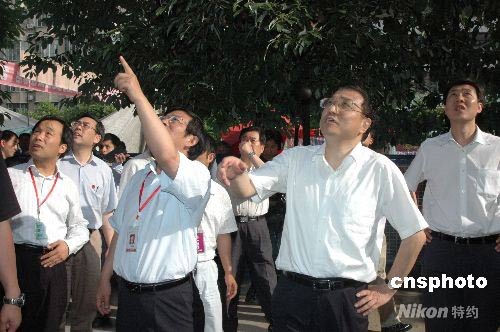 5月18日,中共中央政治局常委、國務(wù)院副總理、國務(wù)院抗震救災總指揮部副總指揮李克強(右)在四川長虹集團董事長趙勇的陪同下,看望住在長虹虹苑劇院里的職工。他關(guān)切地詢問這里是不是危樓。中新社發(fā) 肖龍聯(lián) 攝