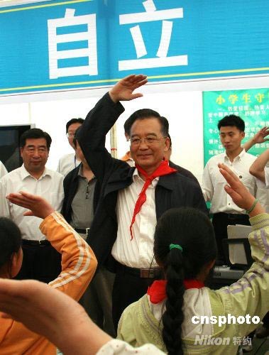 溫家寶和災(zāi)區(qū)帳篷學(xué)校孩子一起敬隊(duì)禮