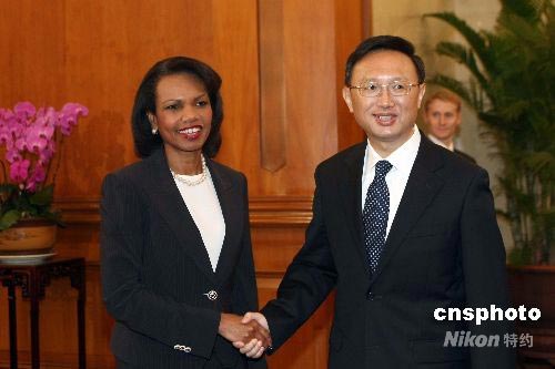 6月29日,中國(guó)外交部部長(zhǎng)楊潔篪在北京釣魚臺(tái)國(guó)賓館與美國(guó)國(guó)務(wù)卿賴斯舉行會(huì)談。中新社發(fā) 盛佳鵬 攝