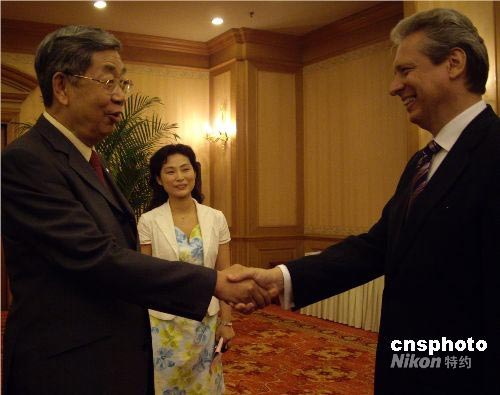 7月8日晚,當(dāng)羅馬尼亞駐華大使伊斯蒂奇瓦亞(右)用一口流利的中文與十屆全國(guó)人大常委會(huì)副委員長(zhǎng)許嘉璐(左)進(jìn)行著一次關(guān)于全球化背景下語言作用的深刻對(duì)話時(shí),漢語無疑搭建了一座溝通中國(guó)與世界心靈與思想的橋梁。 包括伊斯蒂奇瓦亞及秘魯、保加利亞、孟加拉、印尼等國(guó)的駐華使節(jié),隨55個(gè)國(guó)家的100多名大學(xué)生漢語愛好者一道來到湖南長(zhǎng)沙,這些學(xué)生將參加第七屆“漢語橋”世界大學(xué)生中文比賽。當(dāng)晚,許嘉璐在長(zhǎng)沙會(huì)見了駐華使節(jié)一行。中新社發(fā) 傅煜 攝