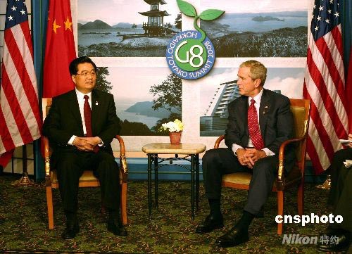 正在日本北海道出席八國集團同發(fā)展中國家領(lǐng)導人對話會的中國國家主席胡錦濤,當?shù)貢r間7月9日下午會見美國總統(tǒng)布什,雙方就中美關(guān)系和其他共同關(guān)心的問題深入交換了意見。布什還表示,希望得到美國和中國的奧運會籃球比賽的門票。他笑著對胡錦濤說:“如果您能幫我搞到票的話,我將非常感激。” 中新社發(fā) 張朔 攝