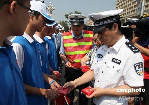 七月十九日,北京交通秩序維護(hù)社會(huì)志愿者全面上崗啟動(dòng)儀式在太廟舉行。在現(xiàn)場(chǎng),來自全市六百名志愿者進(jìn)行莊嚴(yán)宣誓,與會(huì)領(lǐng)導(dǎo)為志愿者授旗并佩發(fā)微笑圈。中新社發(fā) 任海霞 攝