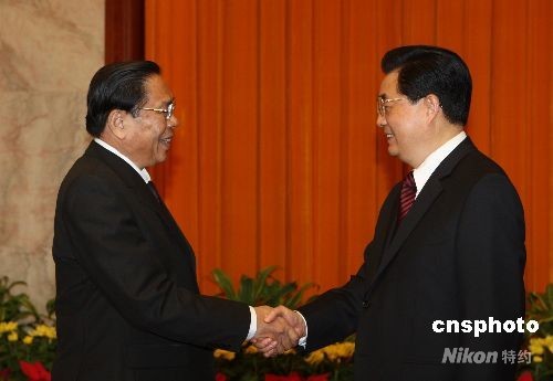 8月7日,中國(guó)國(guó)家主席胡錦濤在北京人民大會(huì)堂會(huì)見(jiàn)應(yīng)邀出席北京奧運(yùn)會(huì)開(kāi)幕式的老撾國(guó)家主席朱馬里。中新社發(fā) 廖文靜 攝