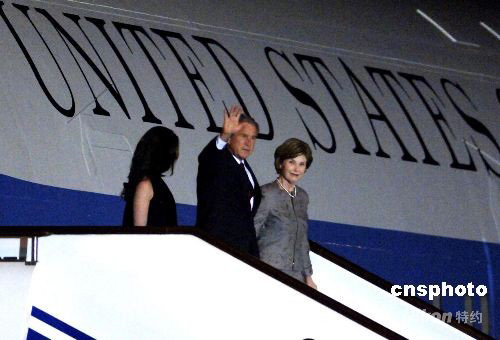 8月7日晚,美國總統布什抵達北京,將出席北京奧運會開幕式。 中新社發(fā) 王東明 攝