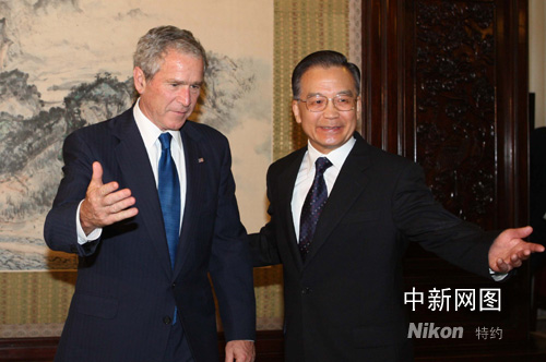 發(fā)表評論  8月10日,中國國務院總理溫家寶在北京中南海會見美國總統(tǒng)布什一行。中新社記者 廖文靜攝