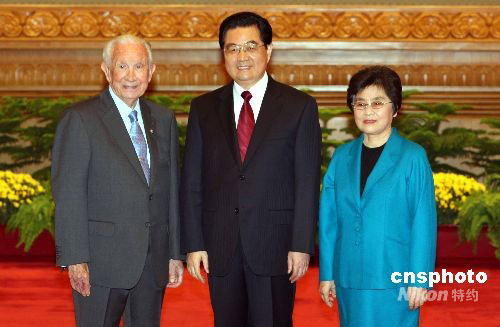 九月六日,中國國家主席胡錦濤和夫人劉永清在北京人民大會堂歡迎出席2008年殘奧會的各國貴賓。圖為胡錦濤夫婦與國際奧委會名譽主席薩馬蘭奇先生合影。中新社發(fā) 任海霞 攝