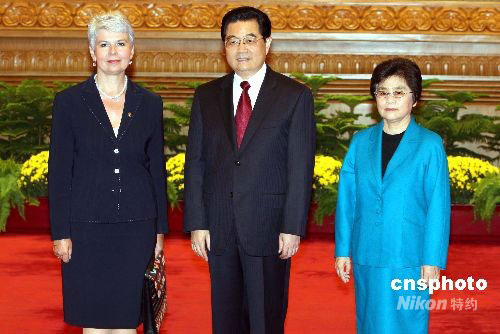 九月六日,國家主席胡錦濤夫婦在北京人民大會堂歡迎出席2008年殘奧會的各國貴賓。圖為胡錦濤夫婦歡迎克羅地亞副總理科索爾。中新社發(fā) 任海霞 攝