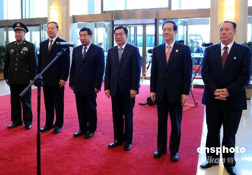 9月23日,中央代表團(tuán)團(tuán)長賀國強(qiáng)(右三)、副團(tuán)長回良玉(左三)、韓啟德(右二)、杜青林(左二)、白立忱(右一)、陳炳德(左一)出席寧夏回族自治區(qū)成立50周年相關(guān)活動。中新社發(fā) 廖攀 攝