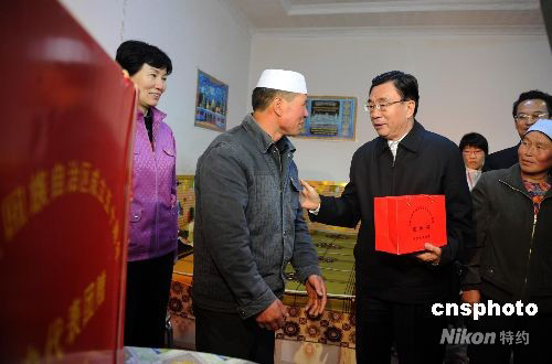 9月25日,賀國強率中央代表團一分團繼續(xù)在寧夏固原市展開慰問,在原州區(qū)吳莊村明忠海家里,賀國強將中央代表團帶來的禮品送給明忠海。中新社發(fā) 廖攀 攝