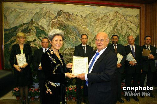 當(dāng)?shù)貢r(shí)間9月25日晚,中國駐英使館舉行國慶59周年招待會(huì)。圖為中國駐英大使傅瑩(左)在招待會(huì)上向英外交部、國際發(fā)展部、英中貿(mào)協(xié)等機(jī)構(gòu)代表及個(gè)人頒發(fā)中國民政部四川地震捐贈(zèng)證書。中新社發(fā) 李鵬 攝