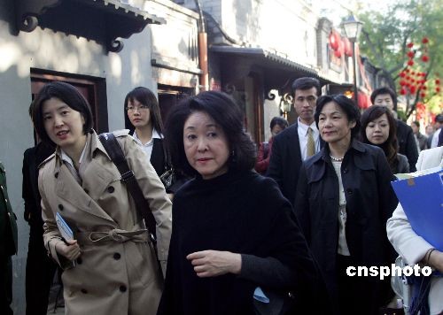 10月24日,日本首相麻生太郎夫人鈴木千賀子(中)游覽北京南鑼鼓巷,領(lǐng)略京城胡同文化。當(dāng)日,有著800年歷史的北京南鑼鼓巷第三屆“胡同節(jié)暨創(chuàng)意集市”開幕,融老北京市井風(fēng)情和創(chuàng)意文化于一體的該活動(dòng)以“迎亞歐峰會(huì)、展南鑼風(fēng)采”為主題。中新社發(fā) 富田 攝