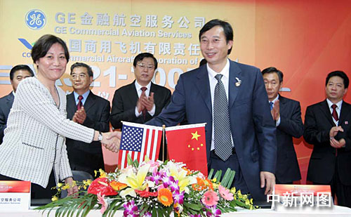 中國(guó)商用飛機(jī)有限責(zé)任公司與美國(guó)通用金融航空服務(wù)公司(GECAS)四日在珠海航展上簽署一份涉及金額近八億美元的二十五架新支線飛機(jī)ARJ21-700的購(gòu)機(jī)協(xié)議。孫自法 攝