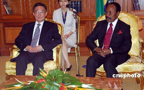當(dāng)?shù)貢r(shí)間七日下午,正在加蓬進(jìn)行正式友好訪問的中國(guó)全國(guó)人大常委會(huì)委員長(zhǎng)吳邦國(guó)在總統(tǒng)府會(huì)見了加蓬總統(tǒng)邦戈,雙方進(jìn)行了親切友好的交談。中新社發(fā) 孫宇挺 攝