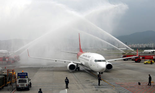 深圳航空首航臺灣班機(jī)抵達(dá)臺北松山機(jī)場