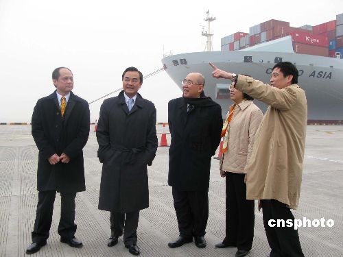 12月20日下午,中共中央臺(tái)辦主任王毅陪同中國(guó)國(guó)民黨主席吳伯雄一行前往上海洋山深水港參觀。中新社發(fā) 張子揚(yáng) 攝