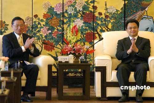 一月九日中午,廣州花園酒店,廣東省副省長萬慶良會見臺灣;鶗麻L江丙坤及海協(xié)會與;鶗(lián)合參訪團一行。中新社發(fā) 柯小軍 攝