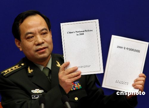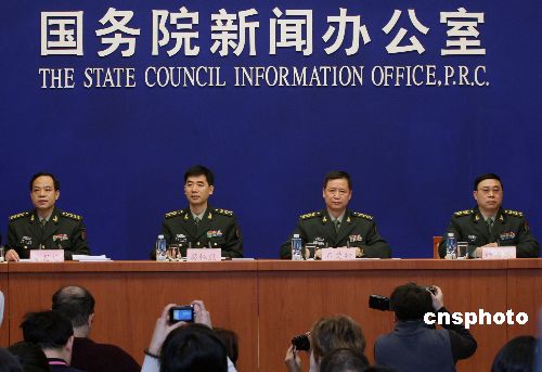 1月20日上午,國(guó)務(wù)院新聞辦公室在北京舉行發(fā)表《2008年中國(guó)的國(guó)防》白皮書(shū)新聞發(fā)布會(huì),國(guó)防部新聞事務(wù)局局長(zhǎng)、國(guó)防部新聞發(fā)言人胡昌明大校做主題發(fā)言,解放軍總參、總政、總后、總裝各部相關(guān)人士到會(huì)回答記者提問(wèn)。中新社發(fā) 宋吉河 攝
