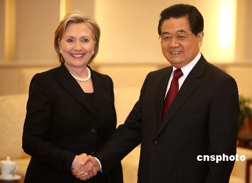 2月21日下午,中國(guó)國(guó)家主席胡錦濤在北京人民大會(huì)堂會(huì)見(jiàn)美國(guó)新任國(guó)務(wù)卿希拉里·克林頓。中新社發(fā) 任晨鳴 攝