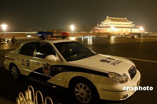 3月3日晚,北京警方在天安門廣場(chǎng)周邊加強(qiáng)夜間巡邏,確!皟蓵(huì)”安全。中新社發(fā) 鄭雄增 攝