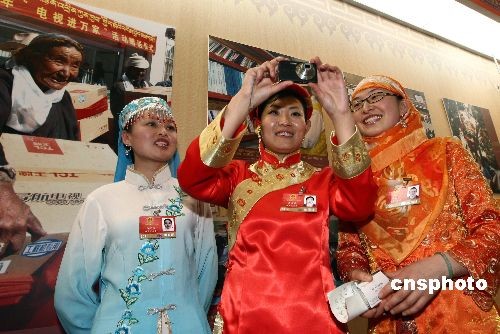 3月8日,參加全國人大的甘肅團代表參觀在北京民族宮舉辦的西藏民主改革50年大型展覽。保安族馬曉琴代表(左)、東鄉(xiāng)族馬含嵐代表(中)、回族畢紅珍代表在展覽現(xiàn)場用相機留下珍貴紀(jì)念。中新社發(fā) 杜洋 攝