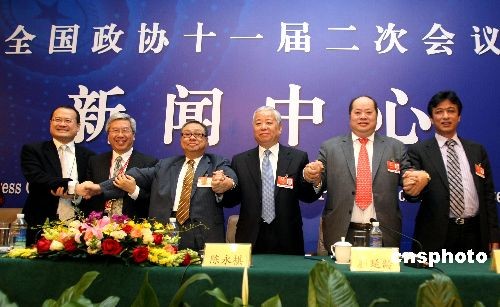 3月10日,全國政協(xié)十一屆二次會(huì)議舉行“港澳委員談如何應(yīng)對(duì)全球金融危機(jī)”專題記者會(huì),陳永棋、李家祥、張華鋒、蔡冠深、許健康、顏延齡委員回答記者提問。記者會(huì)結(jié)束后,六位港澳委員手拉手,表示共同對(duì)抗金融危機(jī)。中新社發(fā) 傅丹丹 攝