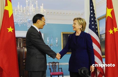 正在美國(guó)訪問(wèn)的中國(guó)外交部長(zhǎng)楊潔篪當(dāng)?shù)貢r(shí)間三月十一日在華盛頓會(huì)見(jiàn)了美國(guó)國(guó)務(wù)卿希拉里。希拉里表示,此前她對(duì)中國(guó)的訪問(wèn)富有成果,她對(duì)中國(guó)外長(zhǎng)這么快進(jìn)行回訪表示高興。中新社發(fā) 邱江波 攝