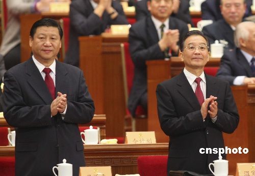 3月12日,全國政協(xié)十一屆二次會議舉行閉幕大會。國務(wù)院總理溫家寶與國家副主席習近平出席閉幕大會。中新社發(fā) 盛佳鵬 攝