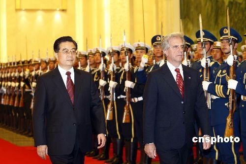 3月23日,中國國家主席胡錦濤在北京人民大會堂舉行儀式歡迎烏拉圭總統(tǒng)巴斯克斯訪華。中新社發(fā) 盛佳鵬 攝